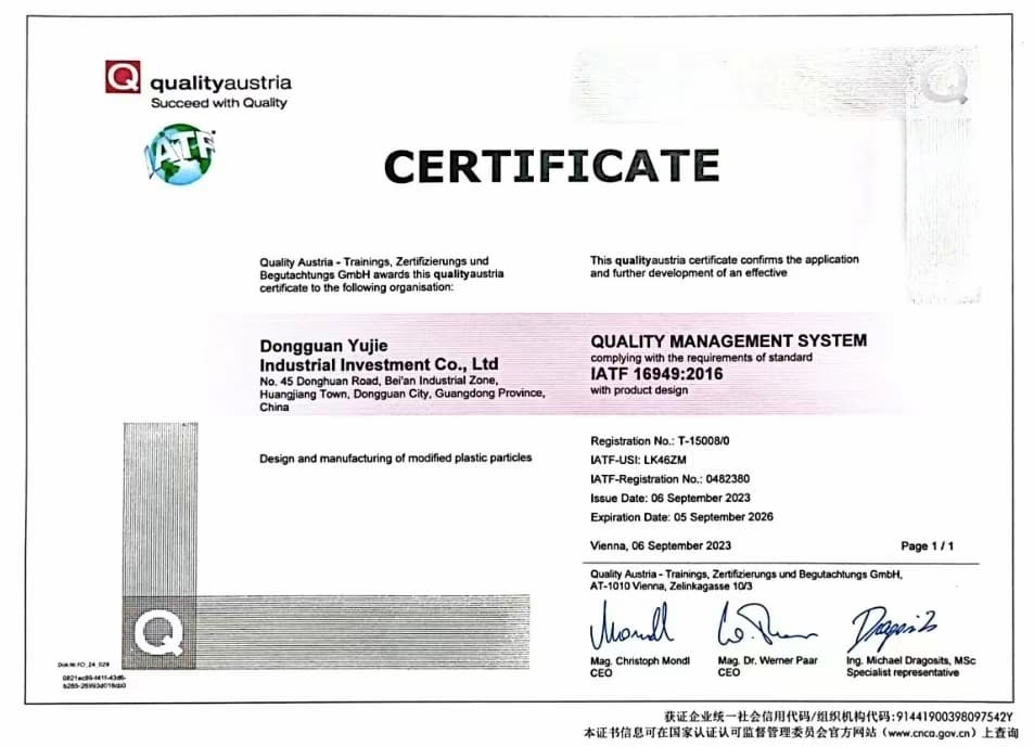 Yujie, üretim kalitesinin her yönünü titizlikle kontrol etti ve sayısız zorluğun üstesinden gelerek ilk kez IATF 16949:2016 sertifikasını başarıyla aldı! ISO 9001'e dayanan 16949 sertifikasyon sistemi, otomotiv endüstrisine özgü teknik özellikleri içerir ve otomotiv endüstrisi kalite yönetim sertifikasyon sisteminin kısaltmasıdır.