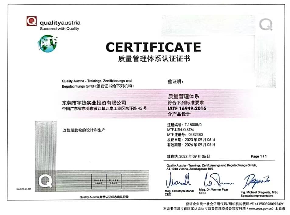 Yujie Industrial Co., Ltd., yüksek kaliteli PCR plastiklerinin inovasyonu, modifikasyonu ve özelleştirilmesi konusunda uzmanlaşmış yüksek teknoloji bir kuruluştur. Şirketin GRS tarafından sertifikalandırılmış başlıca ürünleri arasında RPP, RABS, RPC/ABS alaşımları, PA66 ve PA6 bulunmaktadır. PBT ve diğer ürünler, otomotiv motor kaputları, soğutma fanları, radyatör ızgaraları, tamponlar, filtreler, jant kapakları, kapı kolları, gösterge panelleri, direksiyon simitleri, çamurluklar, far braketleri, dikiz aynası braketleri ve diğer parçalarda kullanılabilir. Okuduğunuz için teşekkür ederiz!
